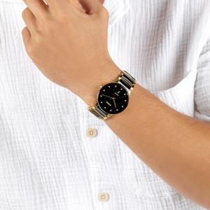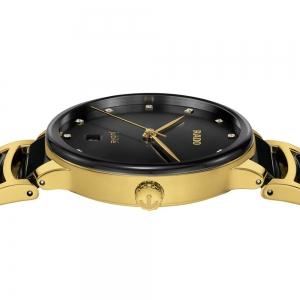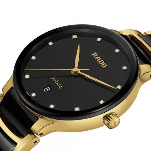 The classic Centrix Quartz Diamonds watch has been reworked not only technically, but also aesthetically. The modified model has a rounded sapphire crystal that extends all the way to the edge and a curved case blending with the curved crystal edge. The overall appearance of this iconic timepiece is completed with adjusted case lugs and a bracelet made of polished yellow gold-coloured PVD-coated stainless steel with black high-tech ceramic. The black sunray dial with 12 diamonds, emphasised with the printed �jubil� logo, matches perfectly with the yellow gold-coloured hands. Thanks to the PreciDrive and HeavyDrive features in the calibre R073 quartz movement, the watch has greater accuracy and resistance to shocks. The watch is water-resistant down to 50 m.