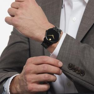 It’s time you owned a masterpiece. The Movado Museum Classic is an icon of modern design, featured in museums worldwide and renown for the elegant simplicity of the dial defined by a single dot at 12 o’clock a design element that symbolizes the sun at high noon. Cast in deep, monochromatic black PVD, this style features a 40mm case and a sinuous five-link bracelet with effortless push-button deployment clasp. We’ve added a gleaming yellow gold PVD finish to the signature dot and slender hands for maximum sophistication.
