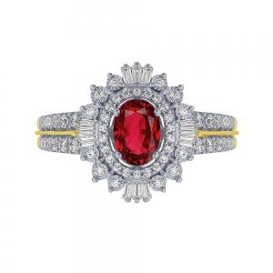Oval Ruby Double Halo With Baguette Accents Split Shank Ring - 0.50 Ct. T.w.